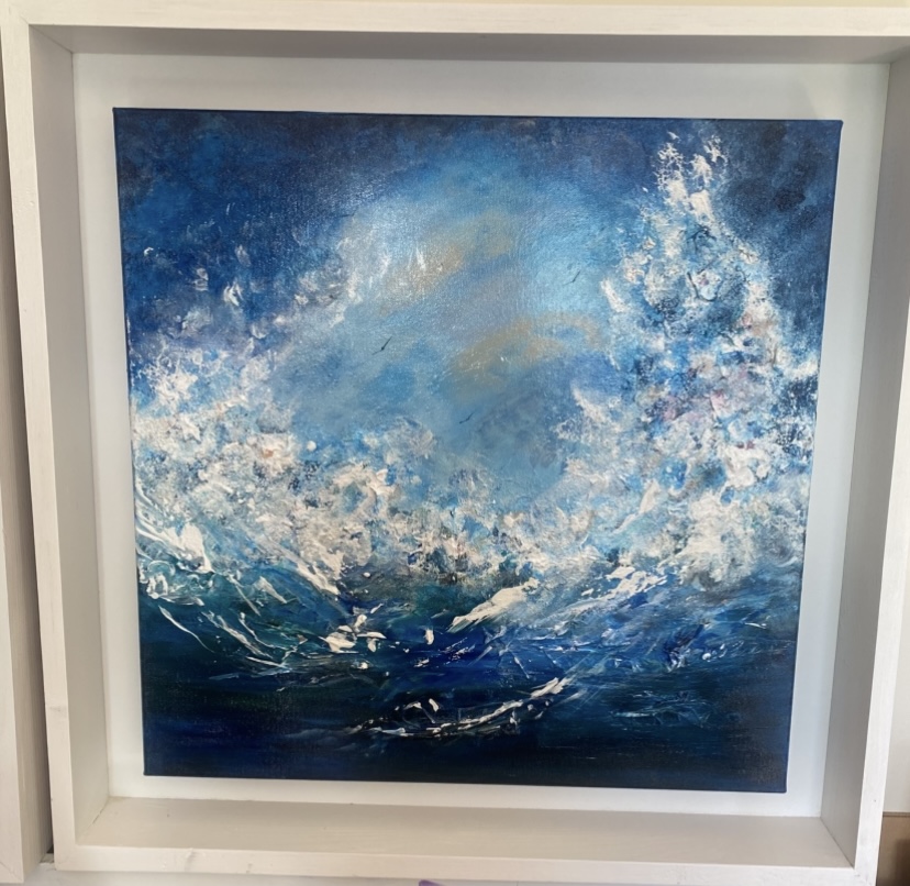 This painting captures the beauty and energy of the ocean. The vibrant colours create a sense of motion and the texture and direction of the palette knife strokes create a constant movement and flow. Hints of beige and white add warmth and ground the painting in nature. I think it is both calming and invigorating at the same time!